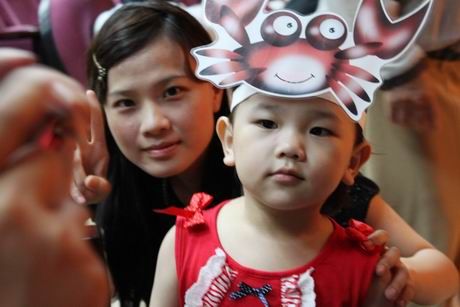 戴上表演用的螃蟹頭套,跟他今天的衣服有搭喔!!