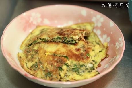 九層塔切碎、然後跟兩顆蛋、一點點鹽巴攪拌均勻,