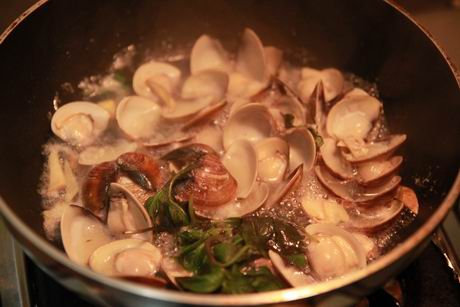 爆香薑絲、放入蛤蠣跟一點米酒,然後蓋上鍋蓋用中小火等蛤蠣都打開,
